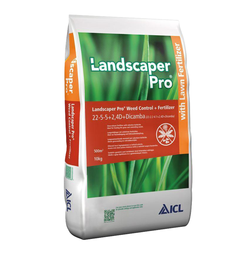 A Landscaper Pro Weed Control 22-5-5+2.4D+Dicamba gyomirtó szert is tartalmazó lassú feltáródású műtrágya. Kiszórás után a gyomirtó szer hozzátapad a gyomok levélfelületéhez, és elfojtja, kiirtja őket a gyepből. Három-négy hét alatt a kétszikű gyomok teljesen eltűnnek a területről, a gyep kizöldül. Tápanyagtartalma segít abban, hogy a fű gyorsan benője a kipusztult gyom helyén maradt üres foltot.