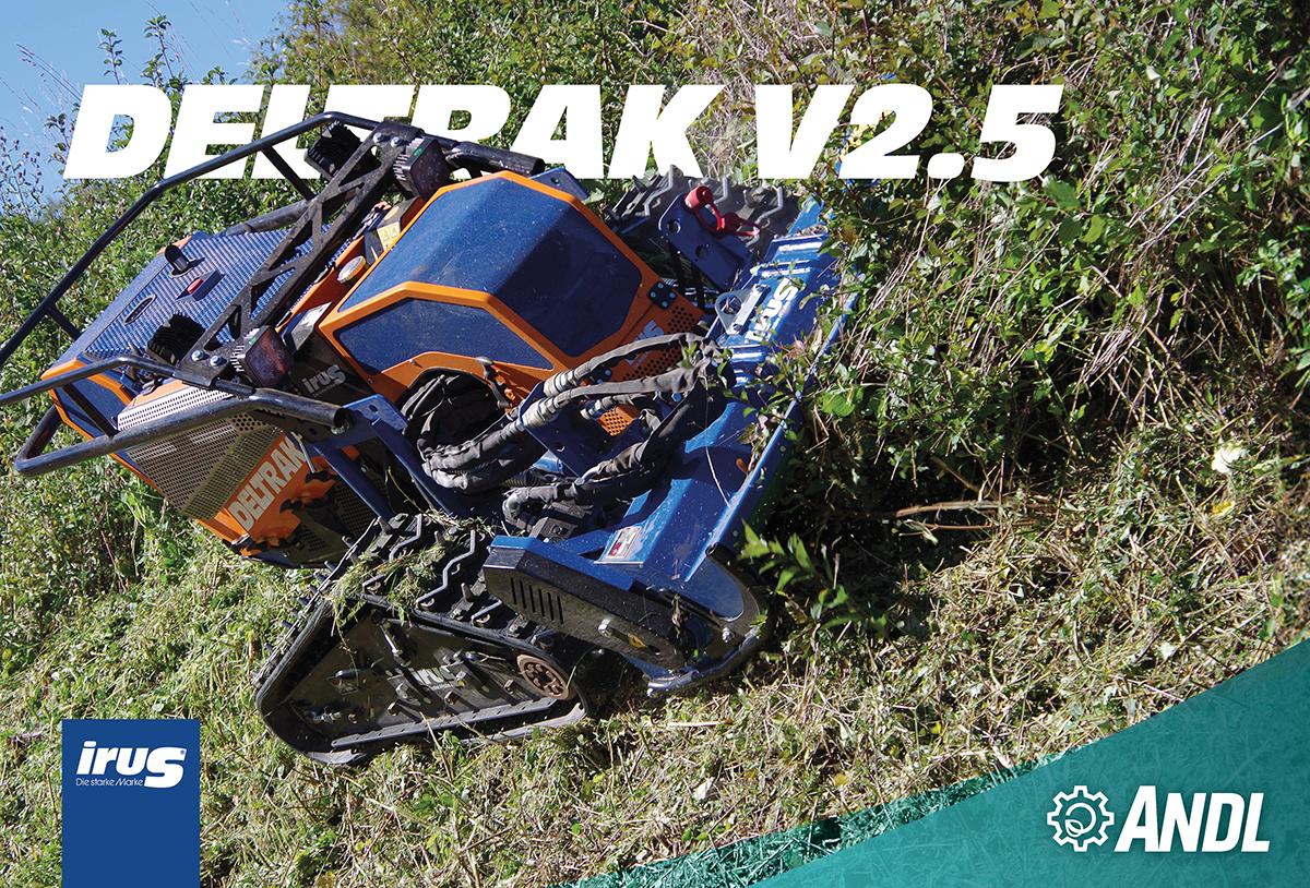 Az IRUS DELTRAK 2.5 egy rádió-távirányítással vezérelt lánctalpas eszköz- és munkagép-alap, amelyet elsősorban nagyfelületű kaszálásra, bozótirtásra, lejtős területek karbantartására és nehéz terepi feladatokra terveztek. A gép kis súlyának és alacsony súlypontjának köszönhetően kiválóan alkalmas meredek domboldalak és nehezen járható területek kezelésére. Erős Kubota dízelmotorja, robusztus hidraulikus hajtása és tartós DELTA lánctalpas futóműve kombinálva egy egyszerűen telepíthető munkagép-platformot alkotnak.