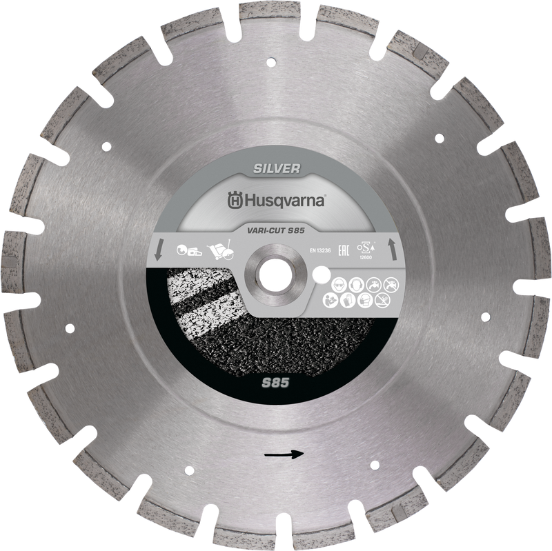 A Husqvarna VARI‑CUT S85 egy professzionális, ezüst (Silver) sorozatú gyémánt vágótárcsa, amelyet kifejezetten aszfalt és egyéb erősen abrazív anyagok vágására terveztek. A szélesebb szegmensnyílások és a védőszegmens segítenek hatékonyan ellenállni a kopásnak, miközben hosszabb élettartamot és jobb vágási teljesítményt biztosítanak még kihívást jelentő munkákban is.