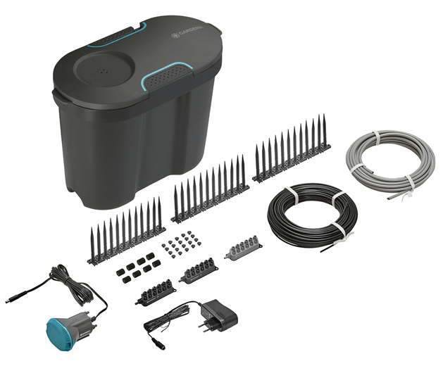 Tartalom: 1x 10,5 l bővíthető víztartály, 1x transzformátor, 1x szivattyú, 3x cseppelosztó 12/db kimenettel, 9 m elosztótömlő, 30 m csepegtető tömlő, 36x tömlőtartó, 20x zárósapka