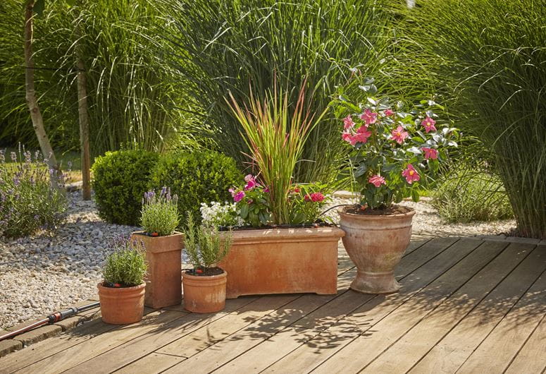 A Gardena Micro Drip System indulókészlet ideális választás cserepes növények öntözéséhez. Az M készlet mindent tartalmaz, ami 7 cserepes növény és 3 virágláda kényelmes és víztakarékos öntözéséhez szükséges. A vízmennyiség cserepenként egyénileg beállítható a növények vízigényeinek megfelelően. A szabadalmaztatott "Klikk és Kész" gyorscsatlakozási technológiának köszönhetően az elemek könnyen összekapcsolhatók és szükség esetén szétszedhetők. A készlet bővíthető további Micro Drip System termékekkel vagy a bővítő készletekkel (13005, 13006) és automatikusan vezérelhető öntözőkomputerrel.