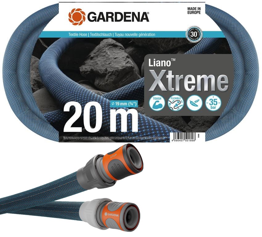 A GARDENA Liano™ Xtreme 19 mm (3/4"), 20 m-es textiltömlő egy prémium minőségű, strapabíró és rugalmas locsolótömlő, amit kifejezetten a közepes méretű kertek intenzív öntözésére terveztek. A 19 mm-es (3/4") átmérő nagy vízáramlást biztosít, így ideális nagy mennyiségű víz gyors szállítására, például nagyméretű esőztetők vagy szivattyúk ellátására. A tömlő előre felszerelt Original GARDENA System csatlakozókkal érkezik, így azonnal használatra kész. Textil borítású külsővel és PVC belsővel készül. Kis súlya miatt egyszerű a tárolása. Tökéletes a hosszú és kihívásokkal teli öntözésekhez. Nagy átmérője a gyorsabb vízátfolyást segíti. Szennytaszító, ellenálló külső borítása tökéletes az érzékenyebb felületekre.