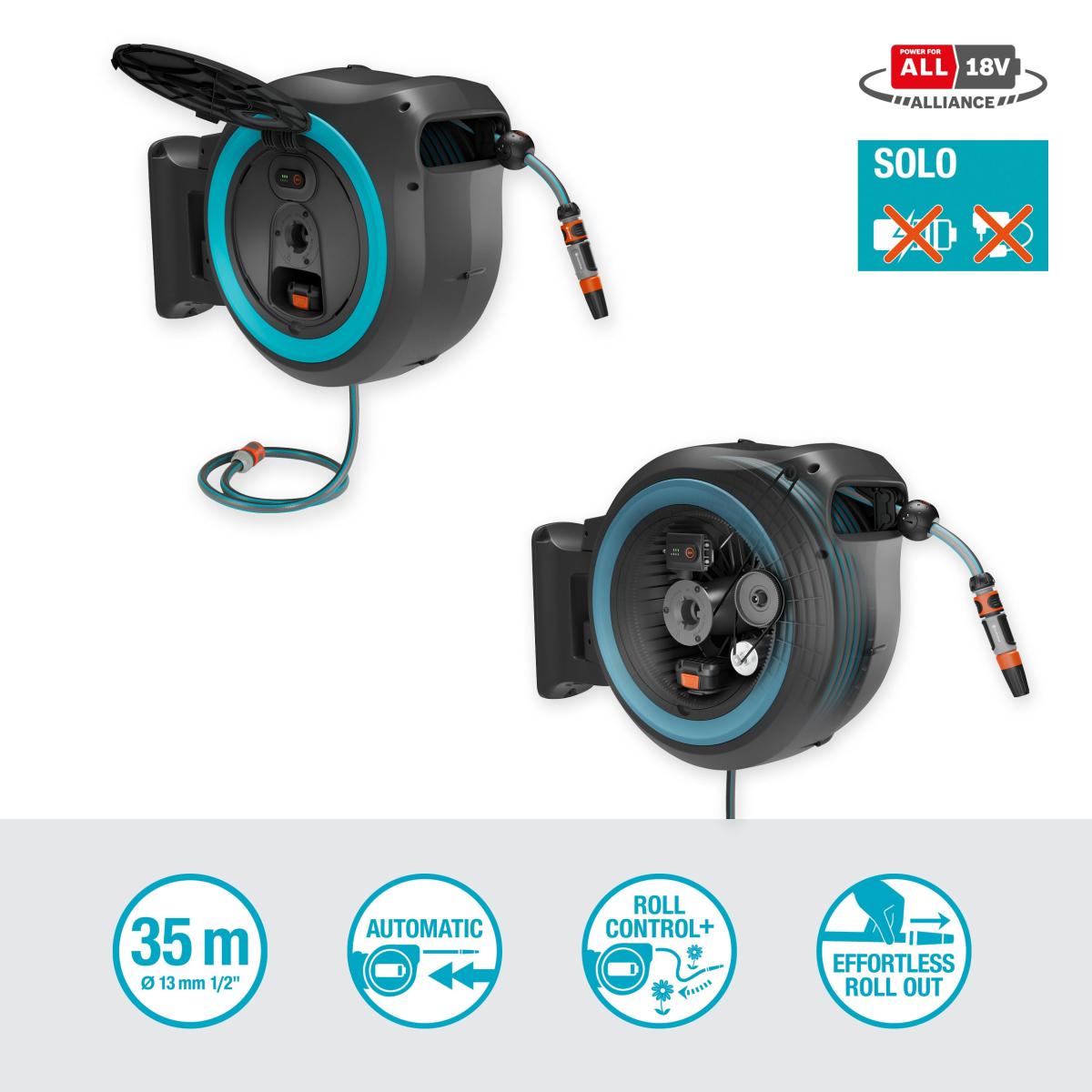 A 18 V-os P4A akkumulátorral működő belső mechanizmusnak köszönhetően a rugalmas tömlő le- és tekercselése automatikusan, erőfeszítés nélkül történik; a két gomb jelenléte, az egyik közvetlenül a tömlő végén és egy a PowerRoll-on, biztosítja, hogy mindkét funkció automatikusan és gyorsan működjön. Ebben a verzióban az akkumulátort NEM tartalmazza, és tanácsos legalább 2,5 Ah-s készüléket használni, amely kompatibilis az azonos platformon található összes termékkel.