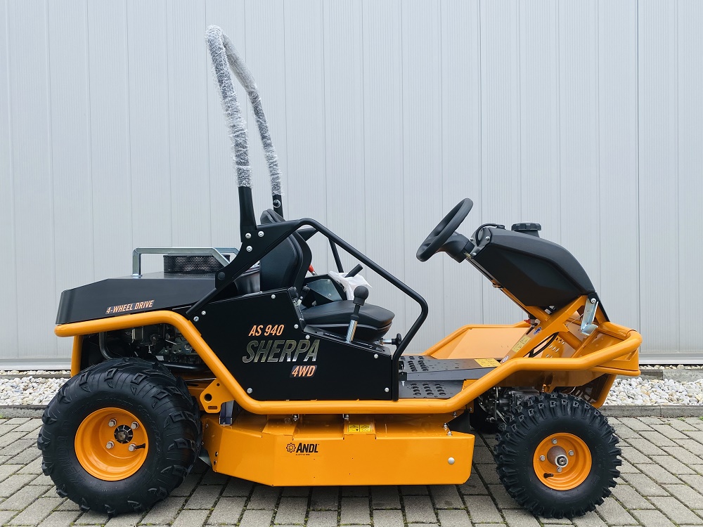 Magasgazvágó állandó összkerékhajtással, nehéz terepre és durva, gazos, cserjés növényzetre.  Az AS 940 Sherpa 4WD felülős magasgazvágó extra üzemanyag- és olajszivattyúval rendelkezik, így a legdurvább rézsűkön is dolgozhat a gép a motor károsodása nélkül. Az állandó négykerék-meghajtás nemcsak a kiemelkedő hajtást, hanem a biztonságot is garantálja, különösen lejtőn: felfelé jobb tapadást, lejtőn pedig erősebb és biztonságosabb fékhatást biztosít. A még nagyobb tapadás érdekében a differenciálzár bármikor lábpedállal rögzíthető. A hidrosztatikus hajtást egyetlen karral vezérelhetjük. Ez a kar négy funkcióval rendelkezik. Az előre és hátra történő mozgást, a féket és a rögzítőféket is ez vezérli. Ezenkívül az AS 940 Sherpa 4WD a jobb oldalon található vészfék-pedállal van felszerelve. Amikor ezt megnyomják, a hajtókar visszatér a középső helyzetbe, és a kézifék automatikusan bekapcsol. Az AS 940 Sherpa 4WD óránként akár 5500 m² területteljesítményt is elérhet. Ezt többek között a nagy teljesítményű Loncin motor teszi lehetővé, amely 2 hengerével és 708 cm3 teljesítményével maximálisan 21,7 lóerőt képes leadni. Ezenkívül a fűnyíró egy 90cm széles, zárt, függesztett vágóasztallal van felszerelve. Ennek eredményeként a rézsűk tetején sem fekszik fel a gép, és a pengék nem érintkeznek a talajjal. A gép alakja és a vágóasztal elhelyezése lehetővé teszi a szegélyek minél pontosabb nyírását. A zárt vágóasztal a nyesedéket hosszabb ideig tartja a kések közelében és nagyon apróra vágja azt. A kereszt-késrendszer az elhajló vágópengékkel vágja le a nyesedéket, a felső mulcsozó kés pedig tovább aprítja azt. A nyesedék kizárólag hátrafelé, a hátsó kerekek között hagyja el a vágóasztalt. Az AS 940 Sherpa 4WD megbízhatóan vágja és aprítja az akár 150 cm-es növényzetet. A vágási magasság központilag, öt lépésben állítható be, 50-105 mm között.